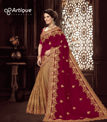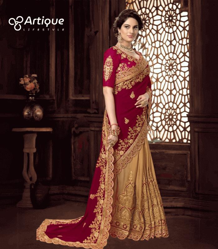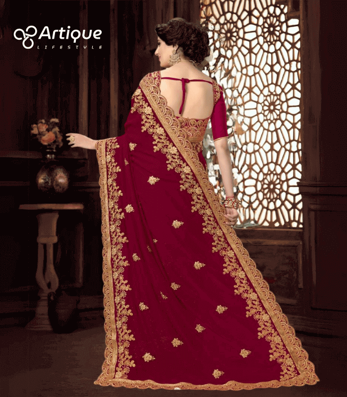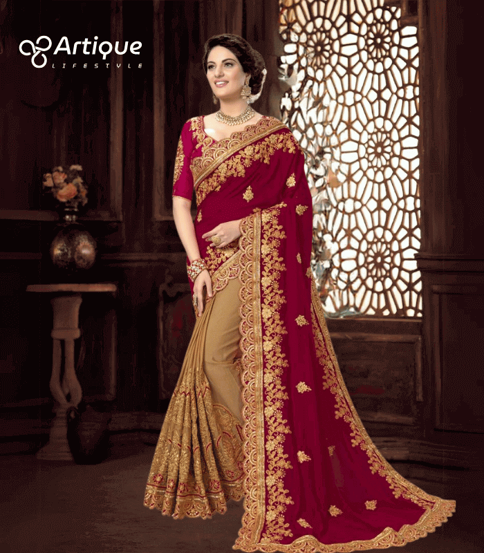 এই ওয়াইন ও বিস্কিট কালারের শাড়ি টি ইন্ডিয়ান ওয়েটলেস সফট জর্জেট ফ্যাব্রিক দিয়ে তৈরী করা এবং সম্পূর্ণ শাড়ির আঁচল ও কুঁচি জুড়ে গোল্ডেন ও ওয়াইন কালার সুতার এমব্রয়ডারি কাজ এটিকে আরও আকর্ষণীয় করে তোলে এবং যেকোনো বিশেষ অনুষ্ঠানের পরিধানের জন্য উপযুক্ত।