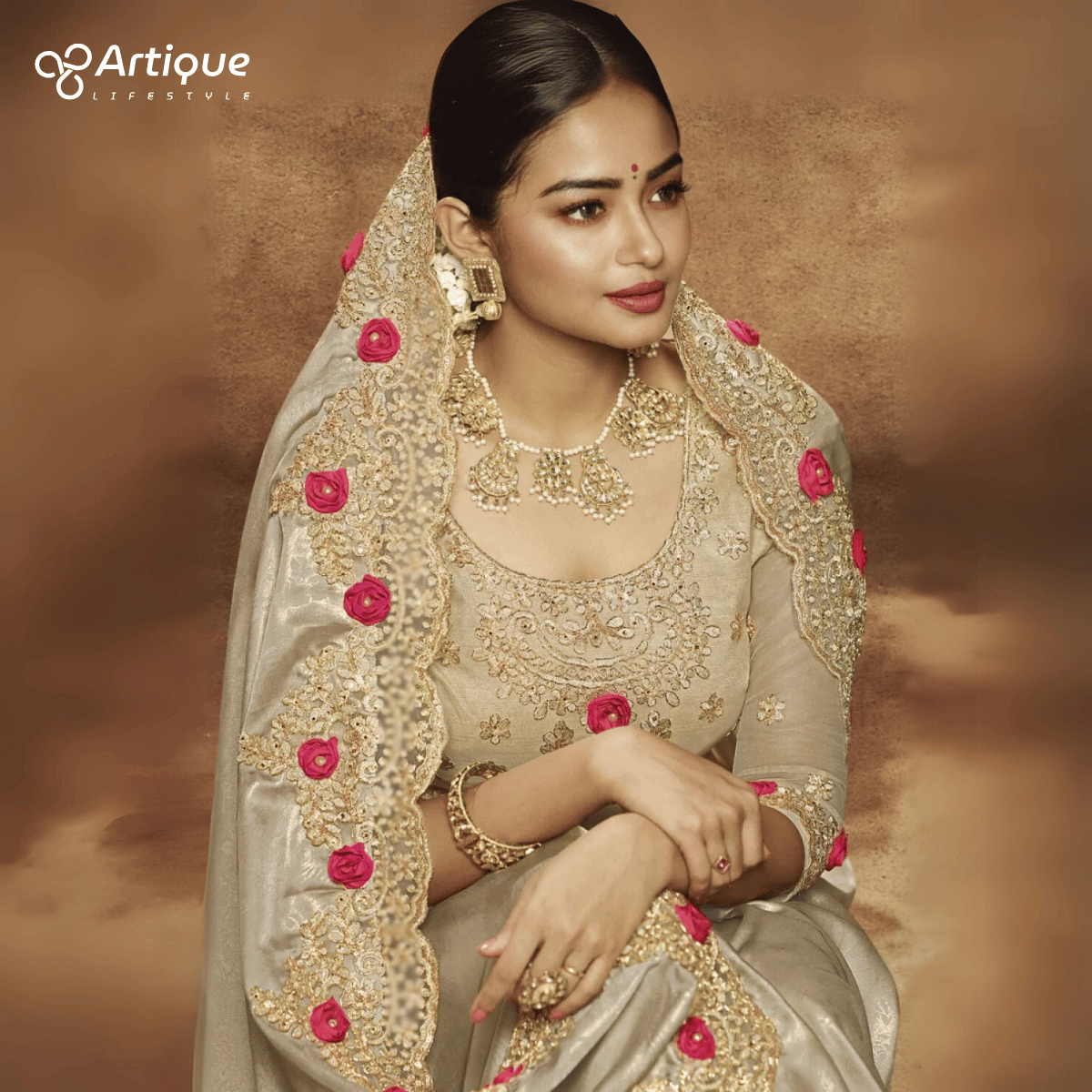 এই গোল্ডেন বিস্কিট কালারের শাড়ি টি সিল্কের ফ্যাব্রিক দিয়ে তৈরী করা এবং সম্পূর্ণ শাড়ির আঁচল ও কুঁচি জুড়ে গোলাপি এবং গোল্ডেন জরি কালার সুতার এমব্রয়ডারি কাজ এটিকে আরও আকর্ষণীয় করে তোলে এবং যেকোনো বিশেষ অনুষ্ঠানের পরিধানের জন্য উপযুক্ত।