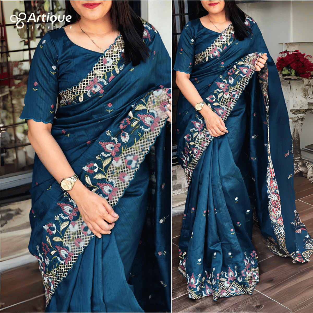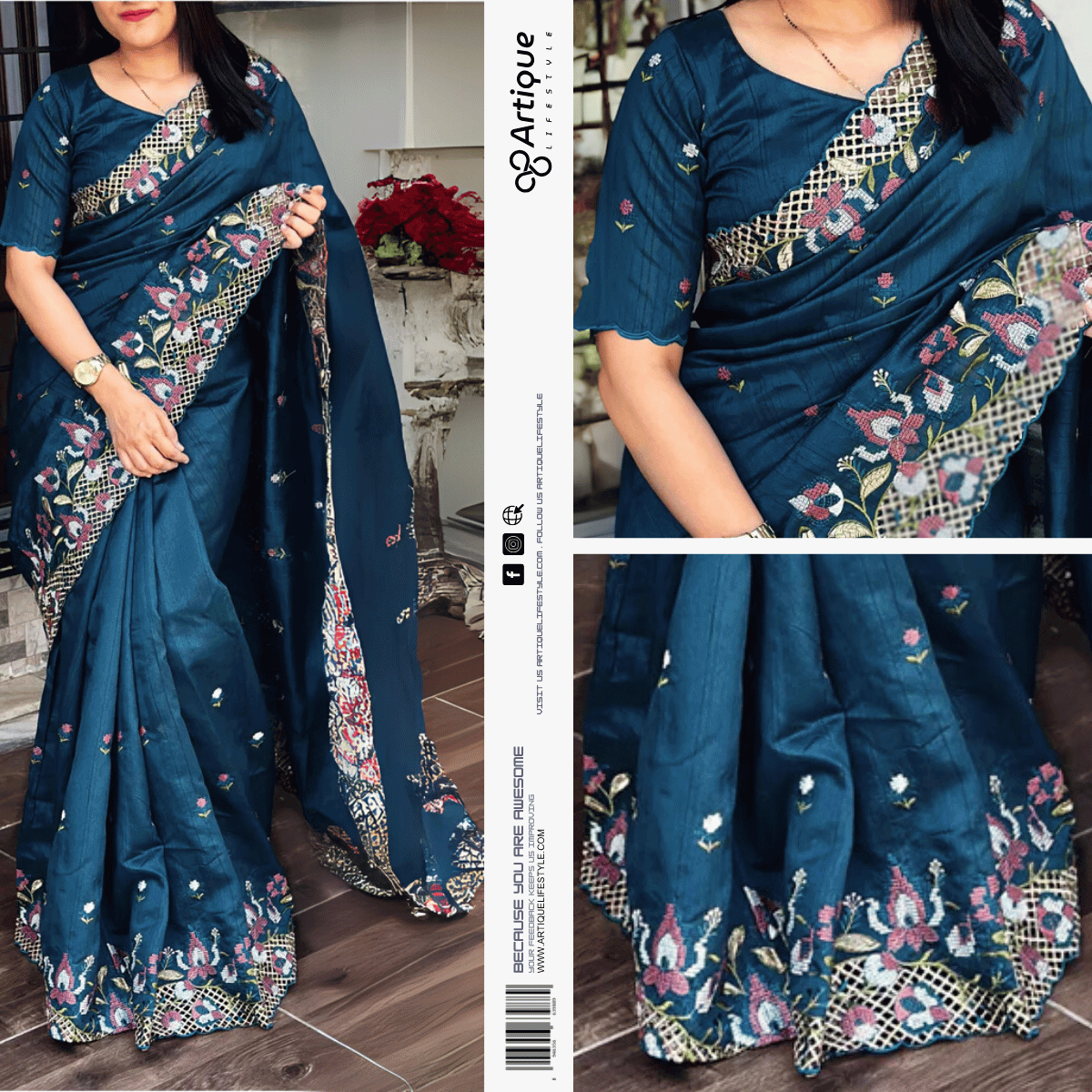 এই টরে কালারের শাড়ি টি ইন্ডিয়ান বিচিত্রা সিল্কের ফ্যাব্রিক দিয়ে তৈরী করা এবং সম্পূর্ণ শাড়ির আঁচল ও কুঁচি জুড়ে বিভিন্ন কালার সুতার এমব্রয়ডারি কাজ এটিকে আরও আকর্ষণীয় করে তোলে এবং যেকোনো বিশেষ অনুষ্ঠানের পরিধানের জন্য উপযুক্ত।
