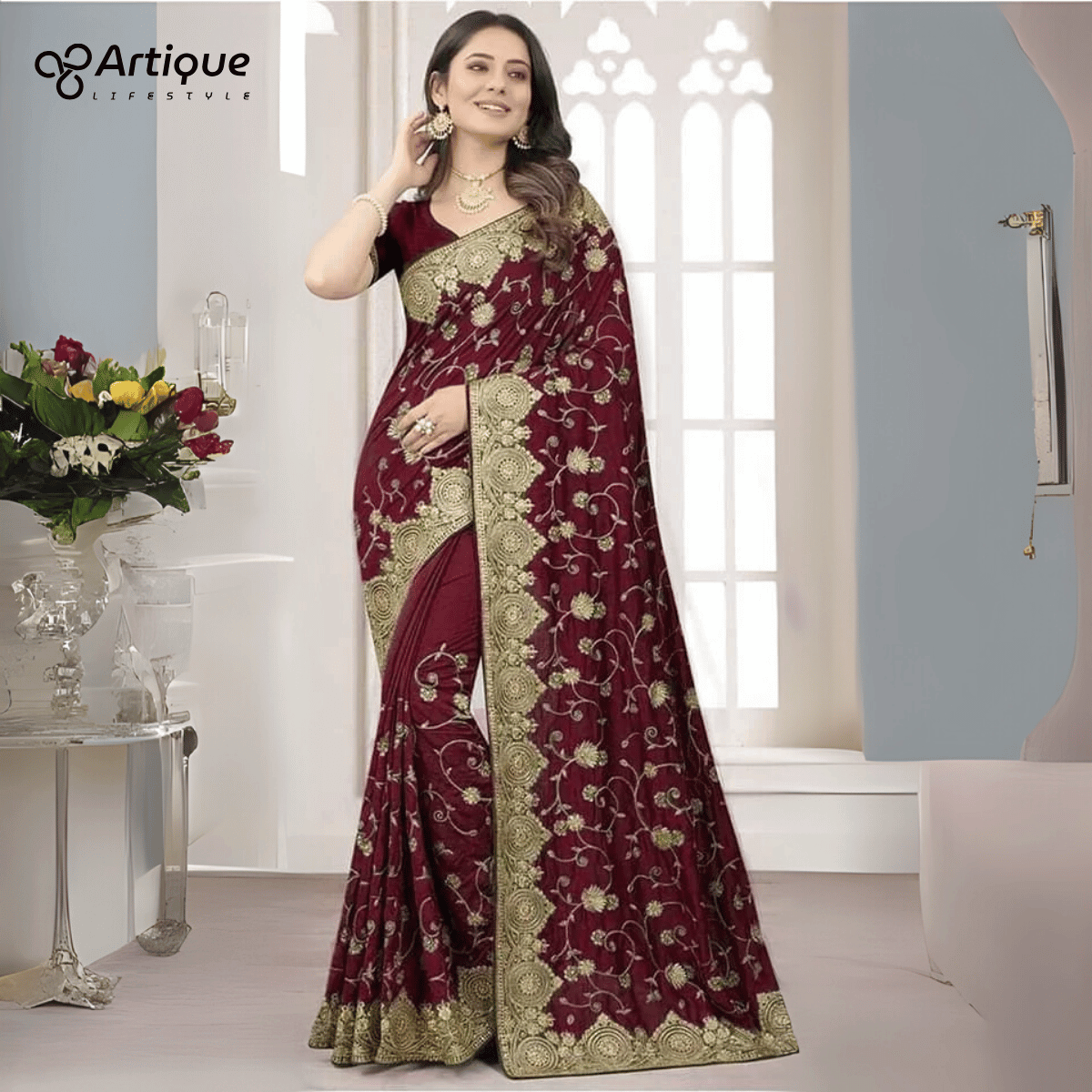 এই মেরুন কালারের শাড়ি টি ইন্ডিয়ান বিচিত্রা সিল্কের ফ্যাব্রিক দিয়ে তৈরী করা এবং সম্পূর্ণ শাড়ির আঁচল ও কুঁচি জুড়ে গোল্ডেন জারি কালার সুতার এমব্রয়ডারি কাজ এটিকে আরও আকর্ষণীয় করে তোলে এবং যেকোনো বিশেষ অনুষ্ঠানের পরিধানের জন্য উপযুক্ত।
