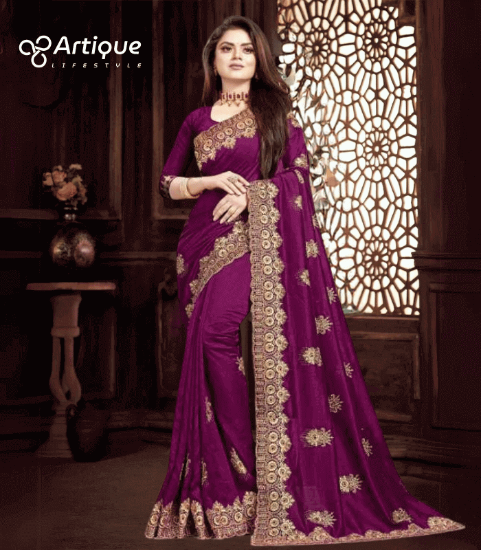 এই পার্পেল কালারের শাড়ি টি ইন্ডিয়ান বিচিত্রা সিল্কের ফ্যাব্রিক দিয়ে তৈরী করা এবং সম্পূর্ণ শাড়ির আঁচল ও কুঁচি জুড়ে গোল্ডেন ও পার্পেল কালার সুতার এমব্রয়ডারি কাজ এটিকে আরও আকর্ষণীয় করে তোলে এবং যেকোনো বিশেষ অনুষ্ঠানের পরিধানের জন্য উপযুক্ত।