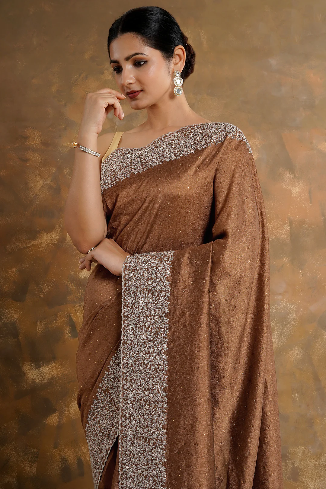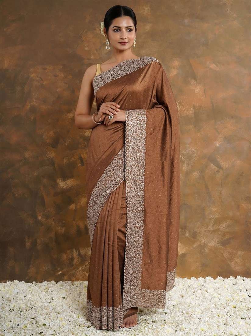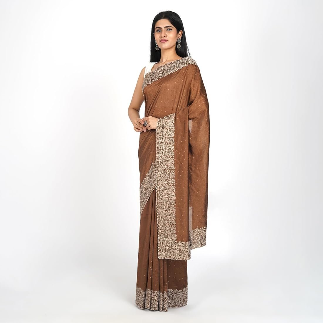 এই কফি কালারের শাড়ি টি ইন্ডিয়ান বিচিত্রা সিল্কের ফ্যাব্রিক দিয়ে তৈরী করা এবং সম্পূর্ণ শাড়ির আঁচল ও কুঁচি জুড়ে জরি কালার সুতার এমব্রয়ডারি কাজ এটিকে আরও আকর্ষণীয় করে তোলে এবং যেকোনো বিশেষ অনুষ্ঠানের পরিধানের জন্য উপযুক্ত।