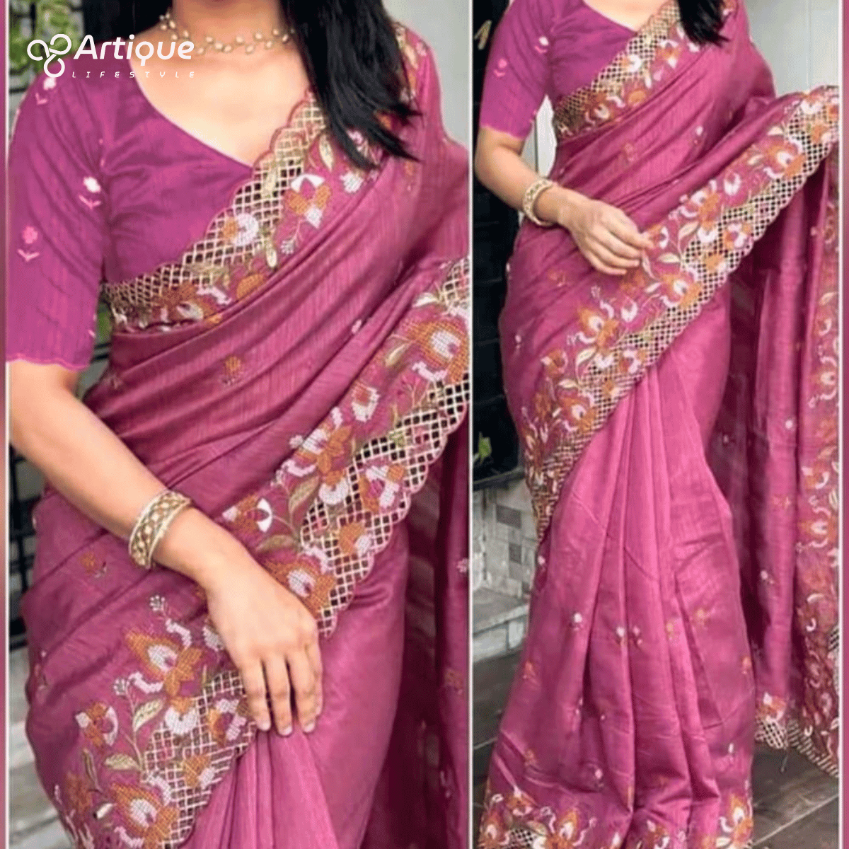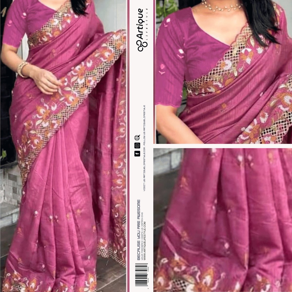 বিঃদ্রঃ এই শাড়িটিতে প্রায় ১২ হাত পর্যন্ত চওড়া এবং ম্যাচিং করা একটি ব্লাউজের পিস্ থাকবে যা সেলাইবিহীন। আপনার পছন্দ অনুযায়ী সেলাই করে নিতে হবে।
