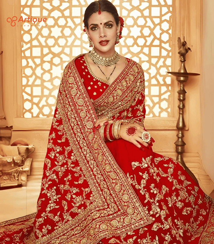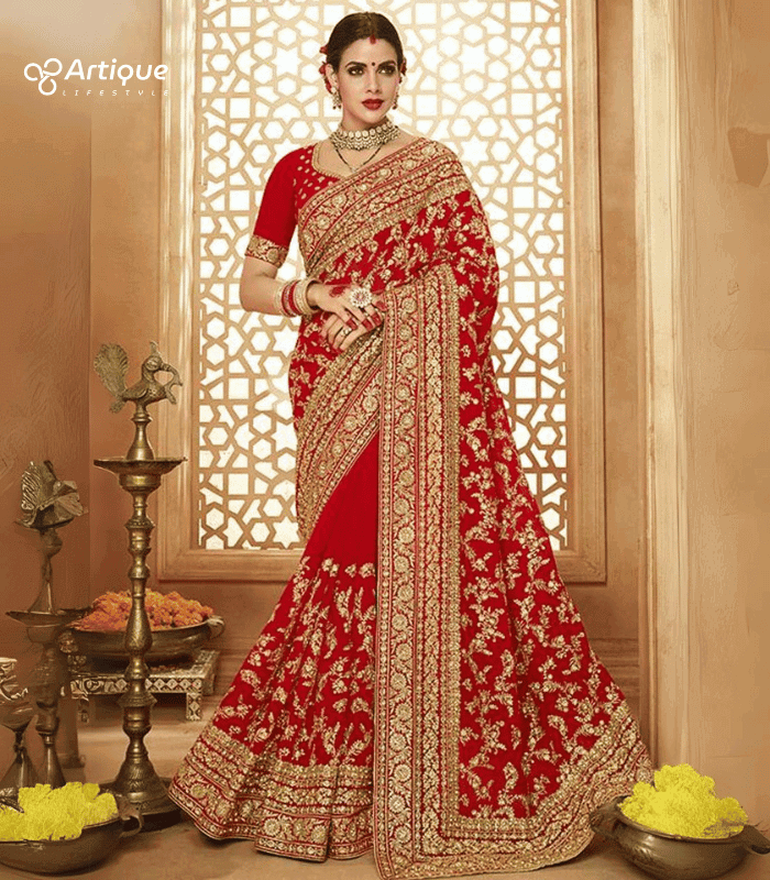 এই লাল কালারের শাড়ি টি ইন্ডিয়ান ওয়েটলেস সফট জর্জেট ফ্যাব্রিক দিয়ে তৈরী করা এবং সম্পূর্ণ শাড়ির আঁচল ও কুঁচি জুড়ে গোল্ডেন কালার সুতার এমব্রয়ডারি কাজ এটিকে আরও আকর্ষণীয় করে তোলে এবং যেকোনো বিশেষ অনুষ্ঠানের পরিধানের জন্য উপযুক্ত।