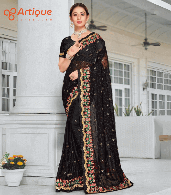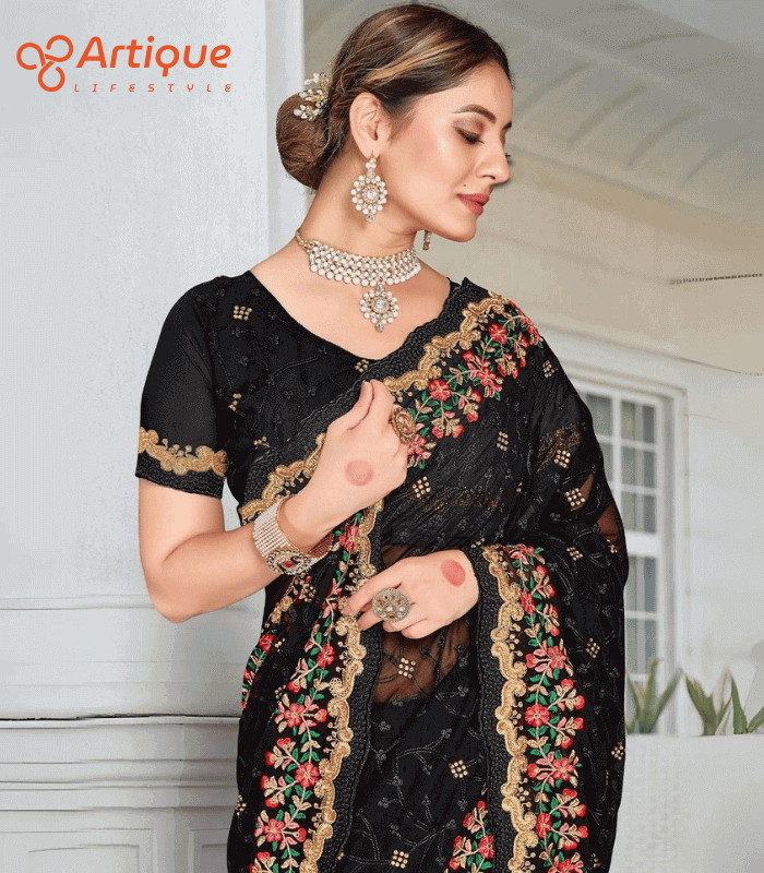 এই কালো কালারের শাড়ি টি ইন্ডিয়ান ওয়েটলেস সফট জর্জেট ফ্যাব্রিক দিয়ে তৈরী করা এবং সম্পূর্ণ শাড়ির আঁচল ও কুঁচি জুড়ে কালো, লাল, সবুজ, গোল্ডেন কালার সুতার এমব্রয়ডারি কাজ এটিকে আরও আকর্ষণীয় করে তোলে এবং যেকোনো বিশেষ অনুষ্ঠানের পরিধানের জন্য উপযুক্ত।