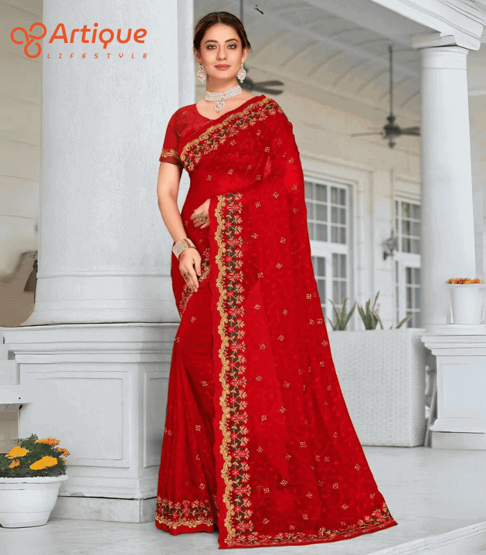 এই লাল কালারের শাড়ি টি ইন্ডিয়ান ওয়েটলেস সফট জর্জেট ফ্যাব্রিক দিয়ে তৈরী করা এবং সম্পূর্ণ শাড়ির আঁচল ও কুঁচি জুড়ে লাল, সবুজ, গোল্ডেন কালার সুতার এমব্রয়ডারি কাজ এটিকে আরও আকর্ষণীয় করে তোলে এবং যেকোনো বিশেষ অনুষ্ঠানের পরিধানের জন্য উপযুক্ত।