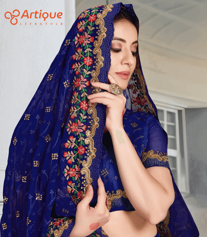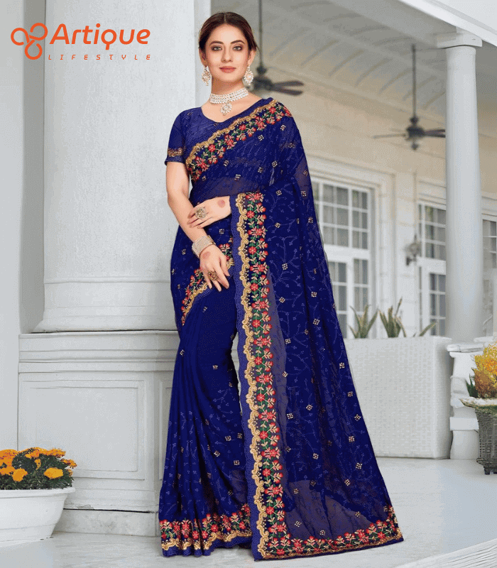 এই নেভি ব্লু কালারের শাড়ি টি ইন্ডিয়ান ওয়েটলেস সফট চিনিগুড়া ফ্যাব্রিক দিয়ে তৈরী করা এবং সম্পূর্ণ শাড়ির আঁচল ও কুঁচি জুড়ে নেভি ব্লু, লাল, সবুজ, গোল্ডেন কালার সুতার এমব্রয়ডারি কাজ এটিকে আরও আকর্ষণীয় করে তোলে এবং যেকোনো বিশেষ অনুষ্ঠানের পরিধানের জন্য উপযুক্ত।