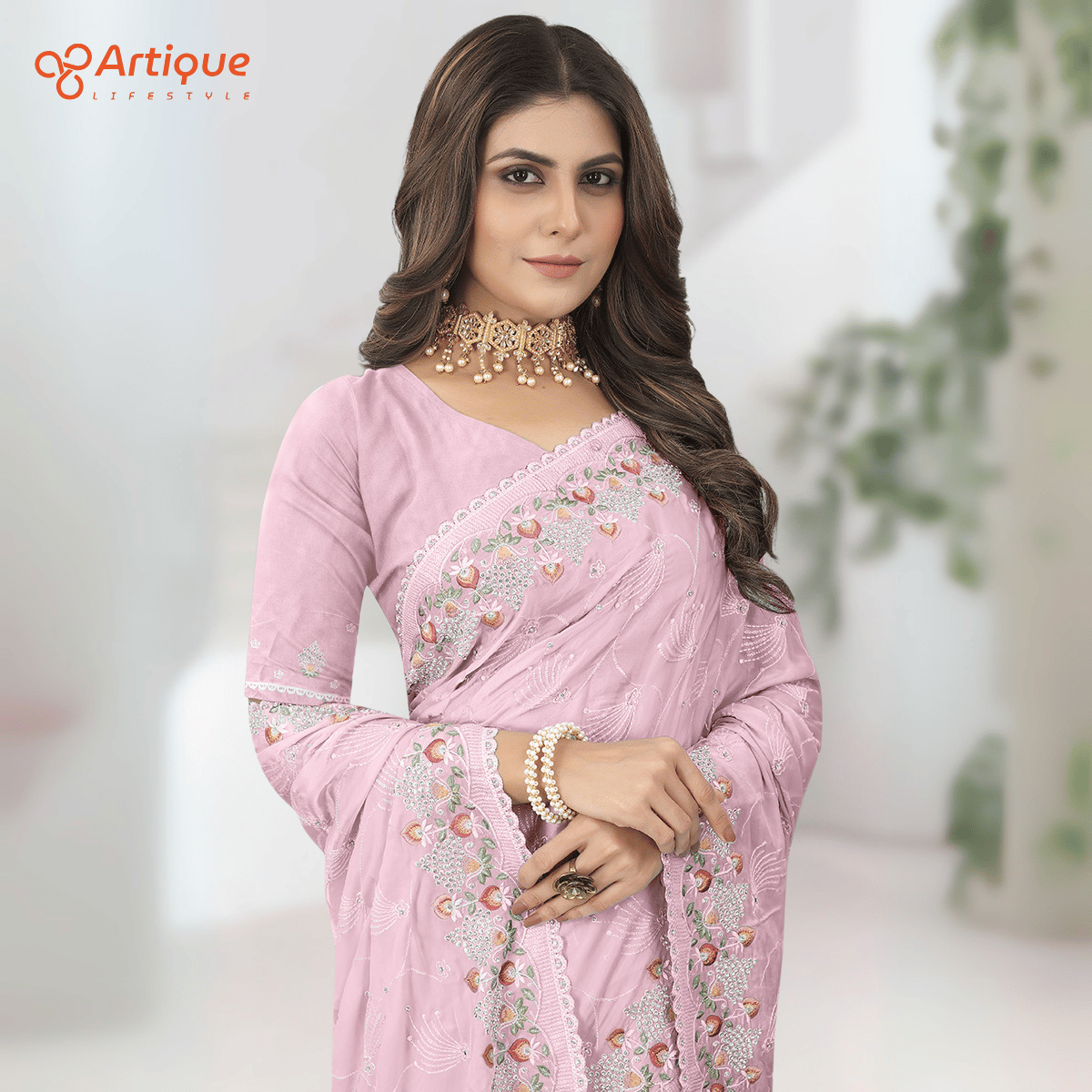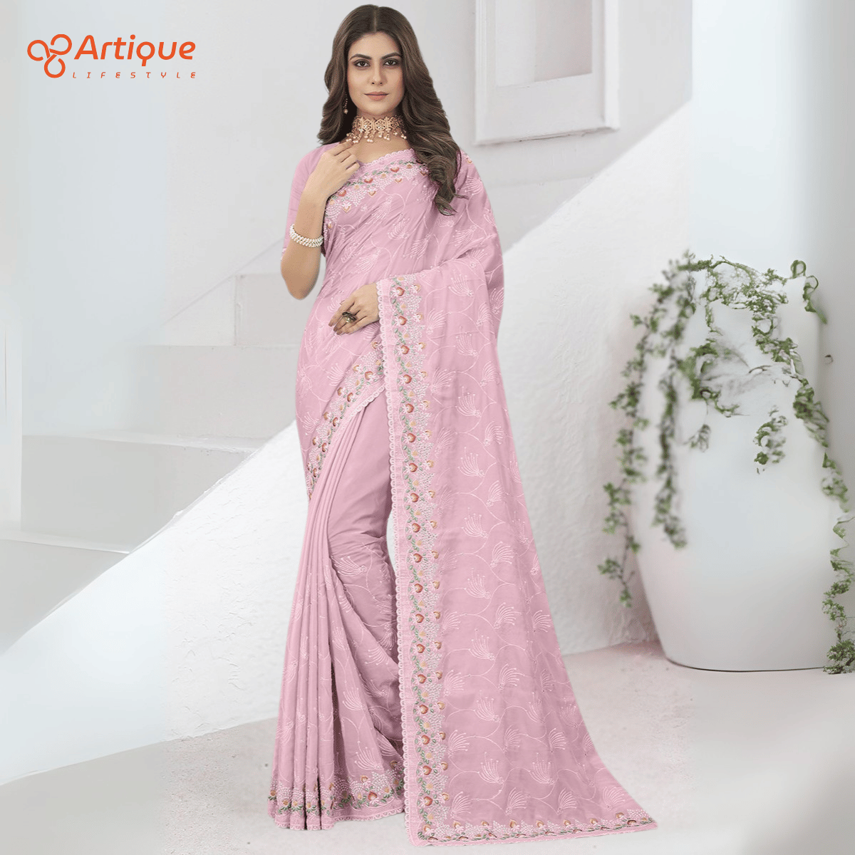 এই লাইট পিংক কালারের শাড়ি টি ইন্ডিয়ান ওয়েটলেস সফট ভিসকোস ফ্যাব্রিক দিয়ে তৈরী করা এবং সম্পূর্ণ শাড়ির আঁচল ও কুঁচি জুড়ে পিংক, লাল, সবুজ, গোল্ডেন কালার সুতার এমব্রয়ডারি কাজ এটিকে আরও আকর্ষণীয় করে তোলে এবং যেকোনো বিশেষ অনুষ্ঠানের পরিধানের জন্য উপযুক্ত।