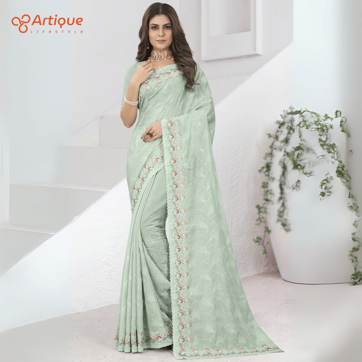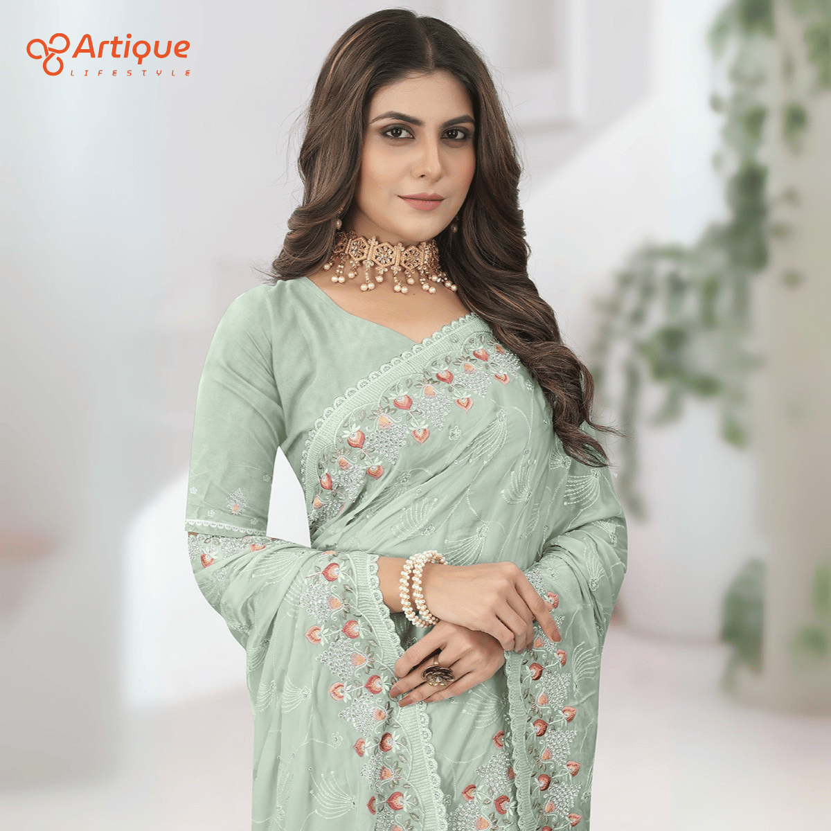এই হালকা সবুজ কালারের শাড়ি টি ইন্ডিয়ান ওয়েটলেস ভিসকোস ফ্যাব্রিক দিয়ে তৈরী করা এবং সম্পূর্ণ শাড়ির আঁচল ও কুঁচি জুড়ে লাল, সাদা, গোল্ডেন কালার সুতার এমব্রয়ডারি কাজ এটিকে আরও আকর্ষণীয় করে তোলে এবং যেকোনো বিশেষ অনুষ্ঠানের পরিধানের জন্য উপযুক্ত।