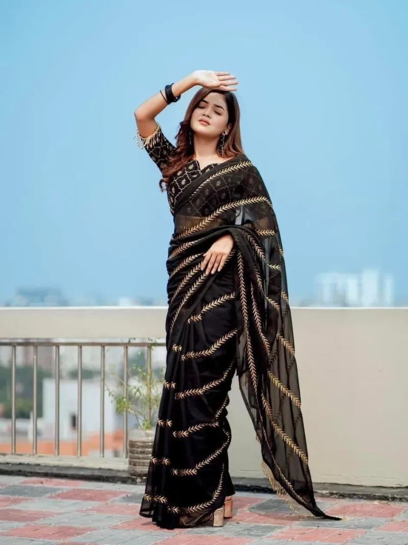 এই কালারের শাড়িটি ইন্ডিয়ান ওয়েটলেস সফট জর্জেট ফ্যাব্রিক দিয়ে তৈরী করা এবং সম্পূর্ণ শাড়ি