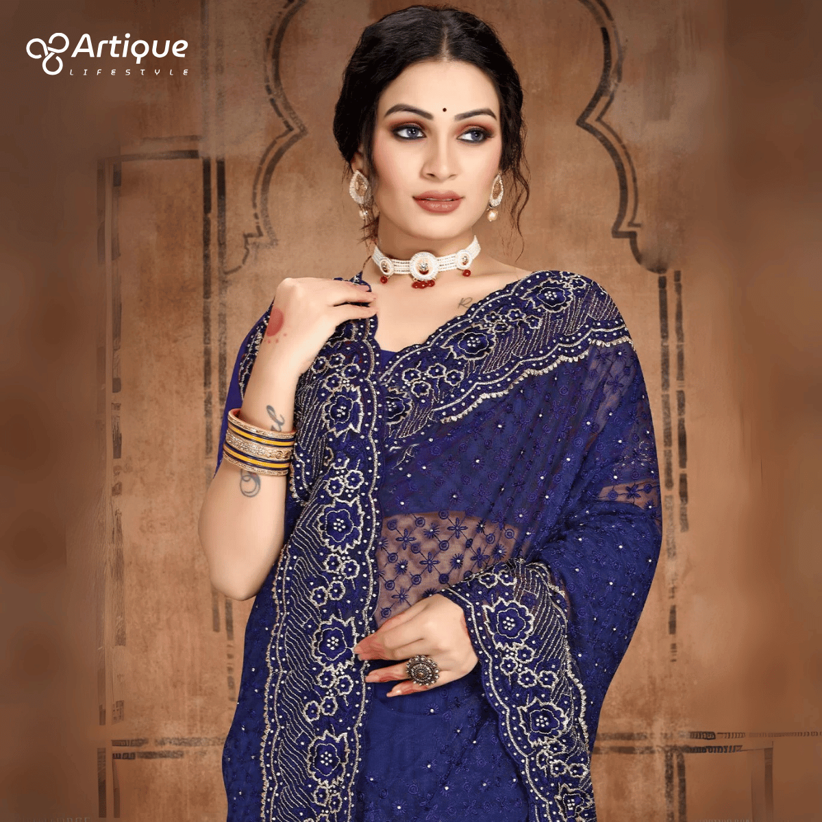এই নেভি ব্লু কালারের শাড়ি টি প্রিমিয়াম অর্গানজা ফ্যাব্রিক দিয়ে তৈরী করা এবং সম্পূর্ণ শাড়ির আঁচল ও কুঁচি জুড়ে নেভি ব্লু এবং সিলভার কালার জরি সুতার এমব্রয়ডারি কাজ এটিকে আরও আকর্ষণীয় করে তোলে এবং যেকোনো বিশেষ অনুষ্ঠানের পরিধানের জন্য উপযুক্ত।