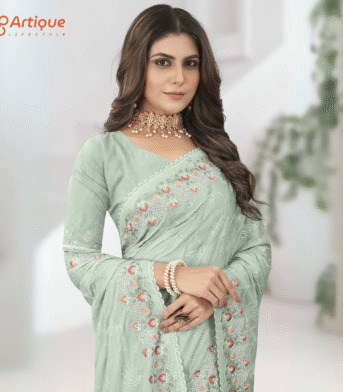 এই বিস্কুট কালারের শাড়ি টি প্রিমিয়াম অর্গানজা ফ্যাব্রিক দিয়ে তৈরী করা এবং সম্পূর্ণ শাড়ির আঁচল ও কুঁচি জুড়ে বাঙ্গি,মিষ্টি,সি গ্রীন, ম্যাচিং এবং জরি সুতার এমব্রয়ডারি কাজ এটিকে আরও আকর্ষণীয় করে তোলে এবং যেকোনো বিশেষ অনুষ্ঠানের পরিধানের জন্য উপযুক্ত।
