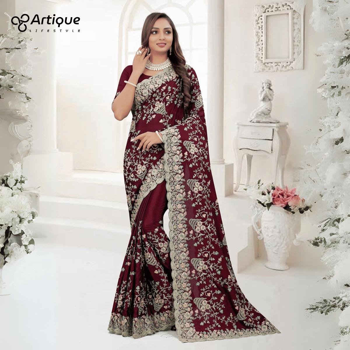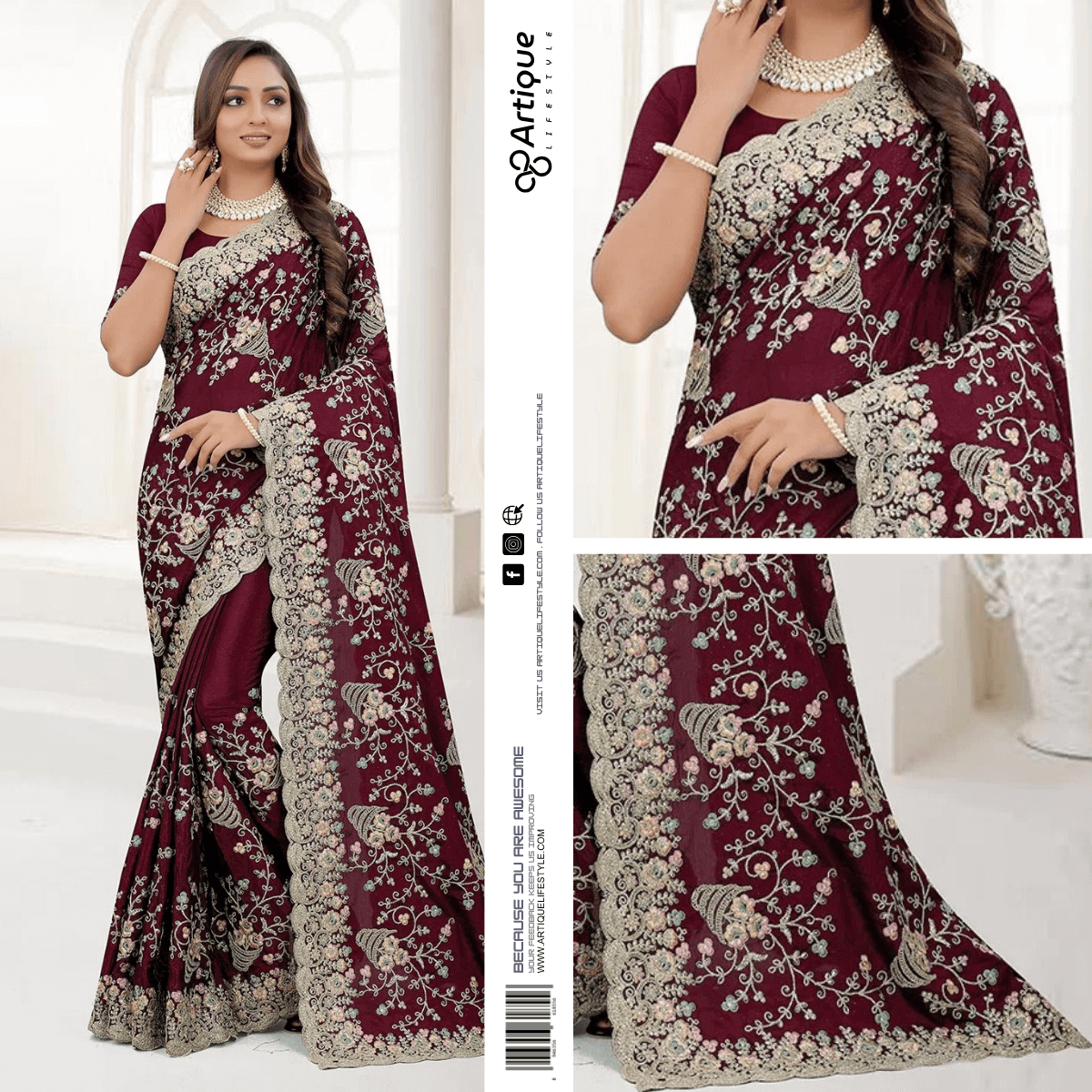 এই মেরুন কালারের শাড়ি টি ইন্ডিয়ান ওয়েটলেস সফট বিচিত্রা সিল্ক ফ্যাব্রিক দিয়ে তৈরী করা এবং সম্পূর্ণ শাড়ির আঁচল ও কুঁচি জুড়ে সিলভার কালার সুতার এমব্রয়ডারি কাজ এটিকে আরও আকর্ষণীয় করে তোলে এবং যেকোনো বিশেষ অনুষ্ঠানের পরিধানের জন্য উপযুক্ত।
