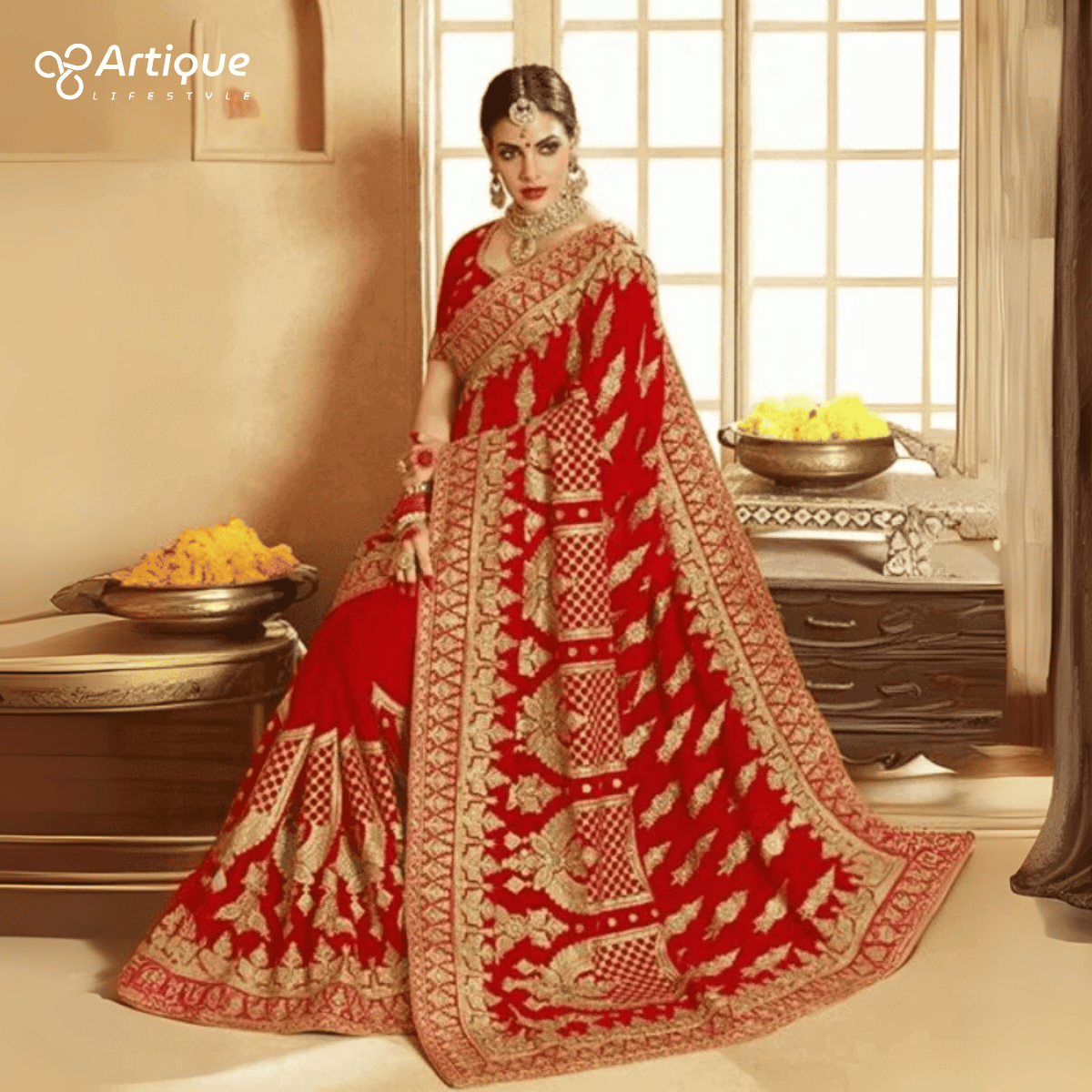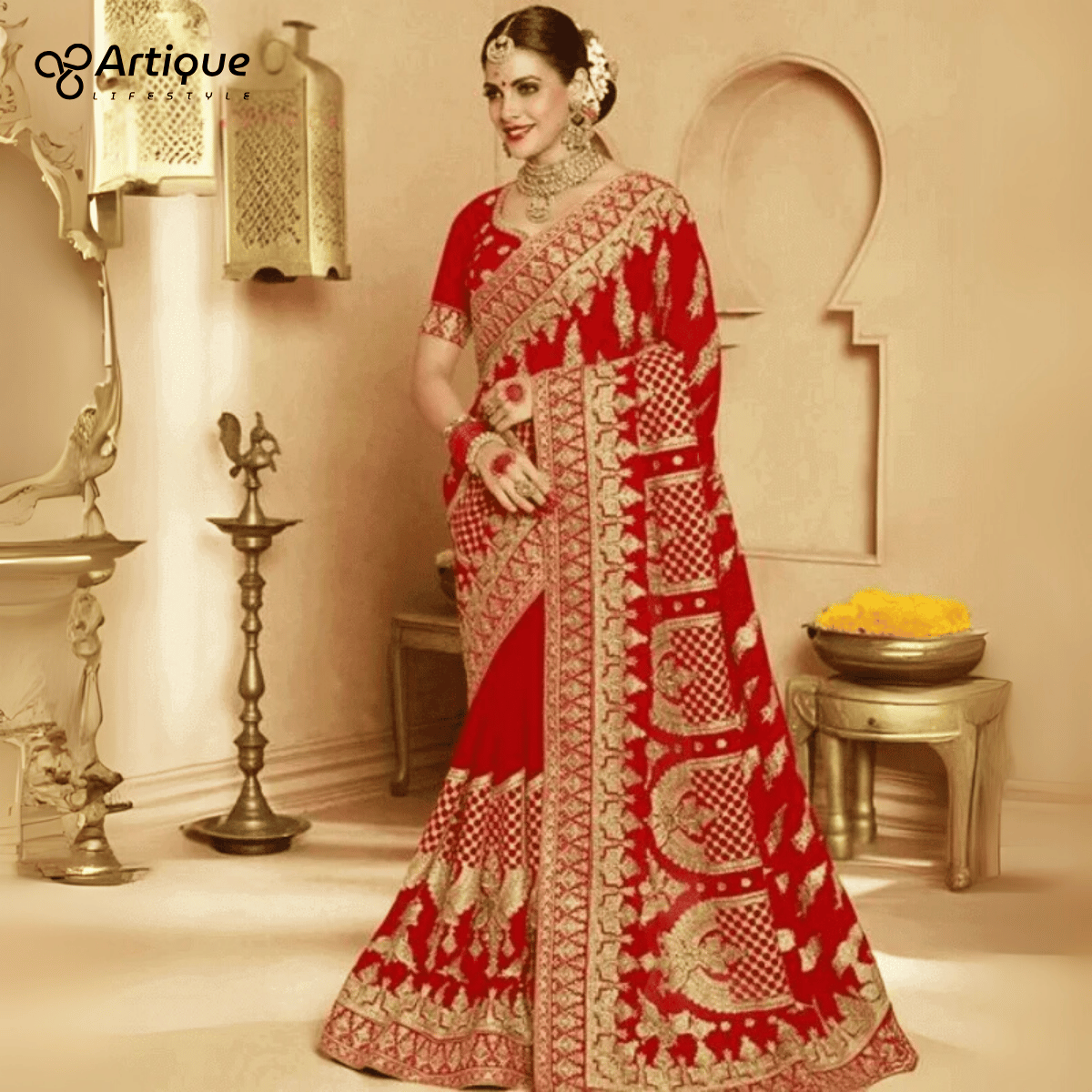 এই লাল কালারের শাড়ি টি ইন্ডিয়ান ওয়েটলেস সফট জর্জেট ফ্যাব্রিক দিয়ে তৈরী করা এবং সম্পূর্ণ শাড়ির আঁচল ও কুঁচি জুড়ে গোল্ডেন কালার সুতার এমব্রয়ডারি কাজ এটিকে আরও আকর্ষণীয় করে তোলে এবং যেকোনো বিশেষ অনুষ্ঠানের পরিধানের জন্য উপযুক্ত।